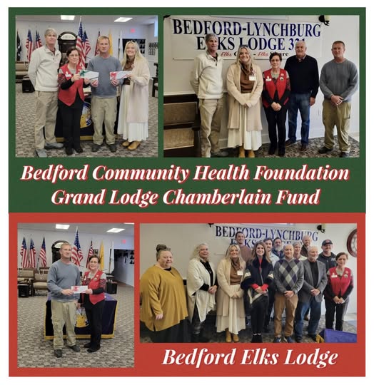 The Bedford/Lynchburg Elks Lodge #321 has the opportunity to present a check to a community Christmas organization from the Grand Lodge Chamberlin Fund. This fund is managed by the Bedford Community Health Foundation. We are grateful to be the 2024 recipient of this generous donation. Pictured here are Denny Huff (BCHF), Patty Brown (BCCS), Lennie Hutton, and Nancy and John Owen from the Bedford/Lynchburg Elks Lodge #321.